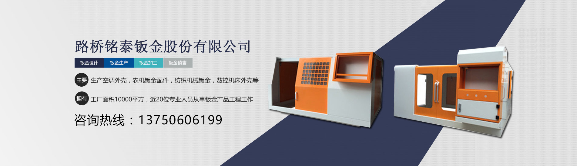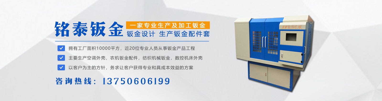 臺(tái)州市路橋銘泰鈑金股份有限公司是一家專(zhuān)業(yè)生產(chǎn)及加工,鈑金設(shè)計(jì),鈑金配件套生產(chǎn)。主要生產(chǎn)空調(diào)外殼,智能電控箱,農(nóng)機(jī)鈑金配件,紡織機(jī)械鈑金,螺桿式空壓機(jī)外殼,數(shù)控機(jī)床外殼,各種設(shè)備外殼等一系列鈑金產(chǎn)品。 公司擁有工廠(chǎng)面積10000平方,近20位專(zhuān)業(yè)人員從事鈑金產(chǎn)品工程工作,職工人數(shù)達(dá)150人。配備精良的開(kāi)發(fā)與生產(chǎn)設(shè)備,現(xiàn)有主要生產(chǎn)設(shè)備:大型激光切管機(jī)(1臺(tái)),數(shù)控6000瓦光纖切割機(jī)(4臺(tái)),數(shù)控沖床(1臺(tái)),數(shù)控折彎?rùn)C(jī)(20臺(tái))大型液壓機(jī)(5臺(tái)),噴塑線(xiàn)(2臺(tái)),氬弧焊機(jī)(30臺(tái)),碰焊機(jī)(5臺(tái))等。 公司宗旨:一直以來(lái)以客戶(hù)為主的方針,不斷改善提高,務(wù)求讓客戶(hù)獲得專(zhuān)業(yè)、具成本效益的方案。歡迎各界朋友蒞臨參觀(guān)、指導(dǎo)和業(yè)務(wù)洽談。